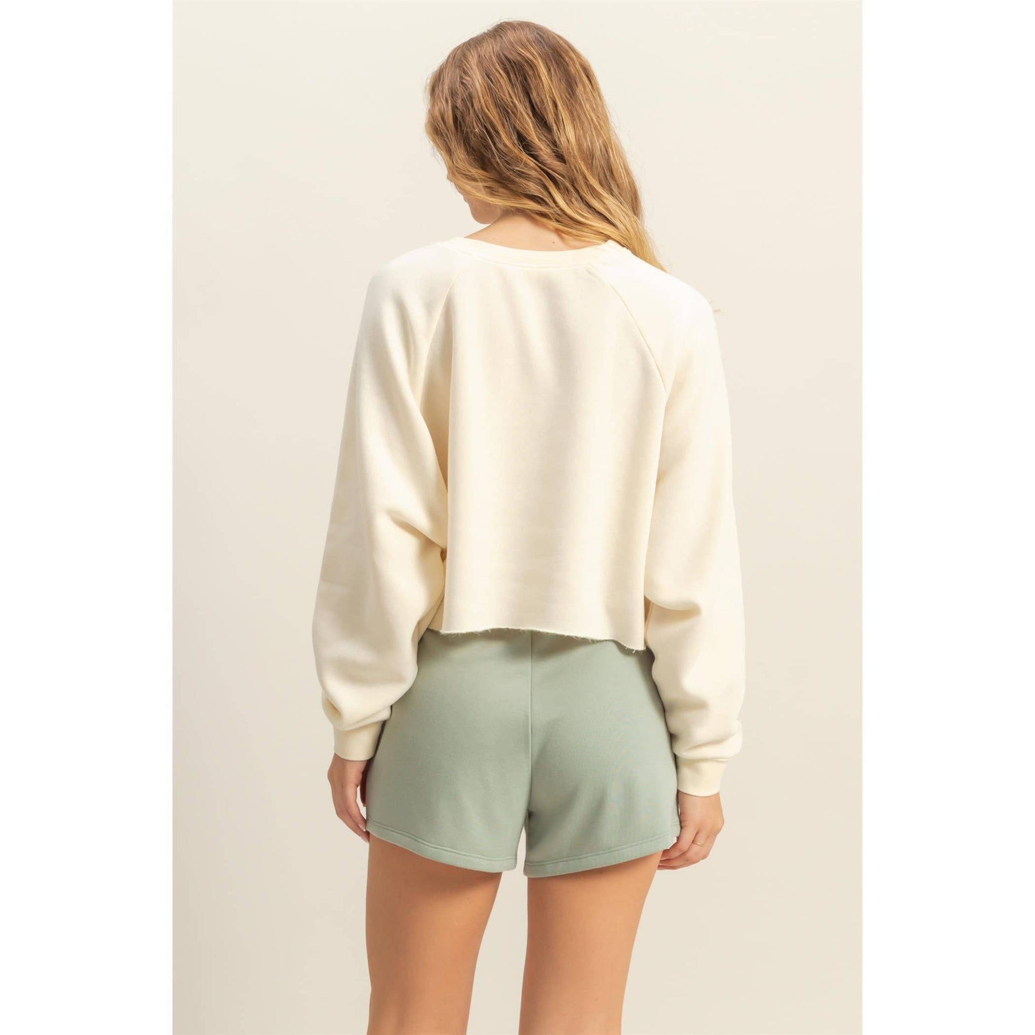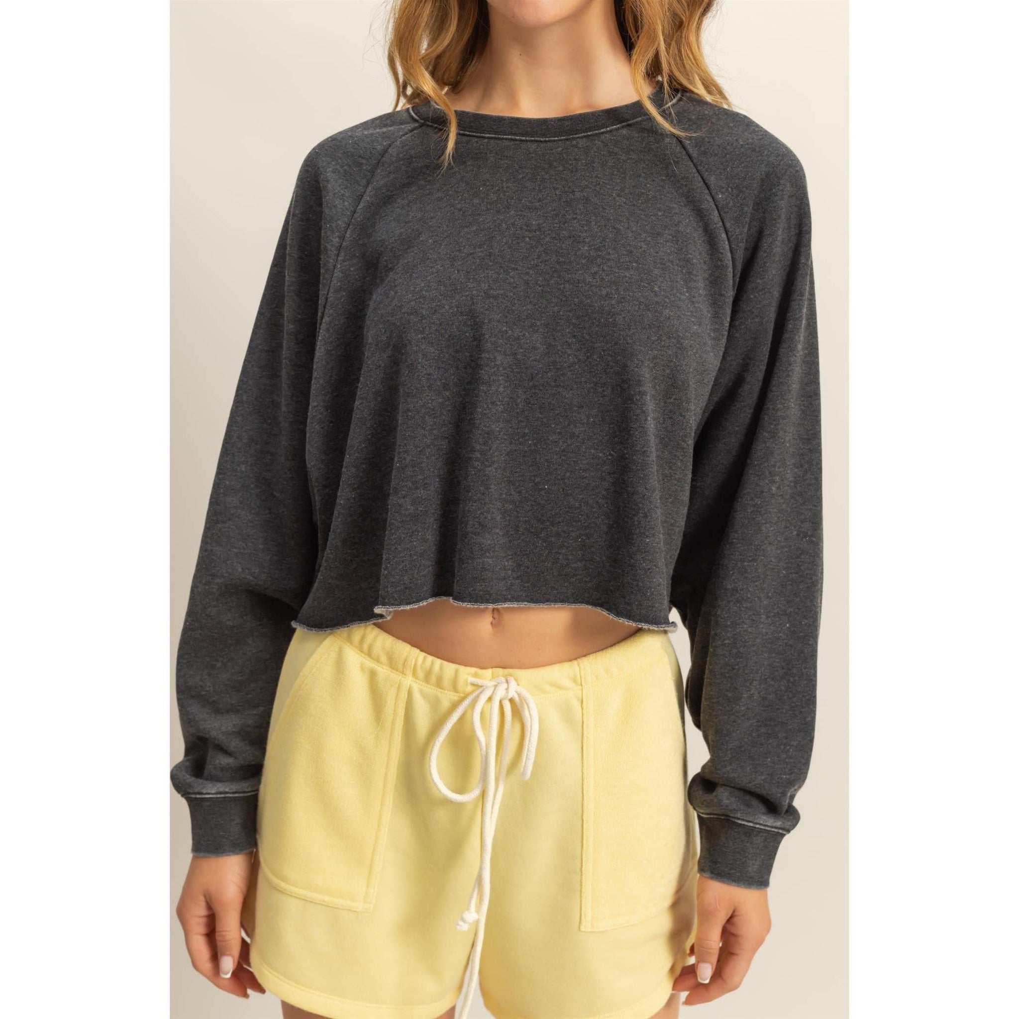 Make Casual Wear Stand Out In A Lightweight And Breathable Crop Sweatshirt That Has A Crew Neckline, Dropped Shoulders, A Boxy Bodice, Long Sleeves With Fitted Cuffs, And A Cute Cropped Waist With Raw Edge Accents On The Hem. 51% Cotton 49% Polyester Model Is 5' 9" Tall, 32" Chest, 23" Waist, 35" Hips And Wearing A Size Small