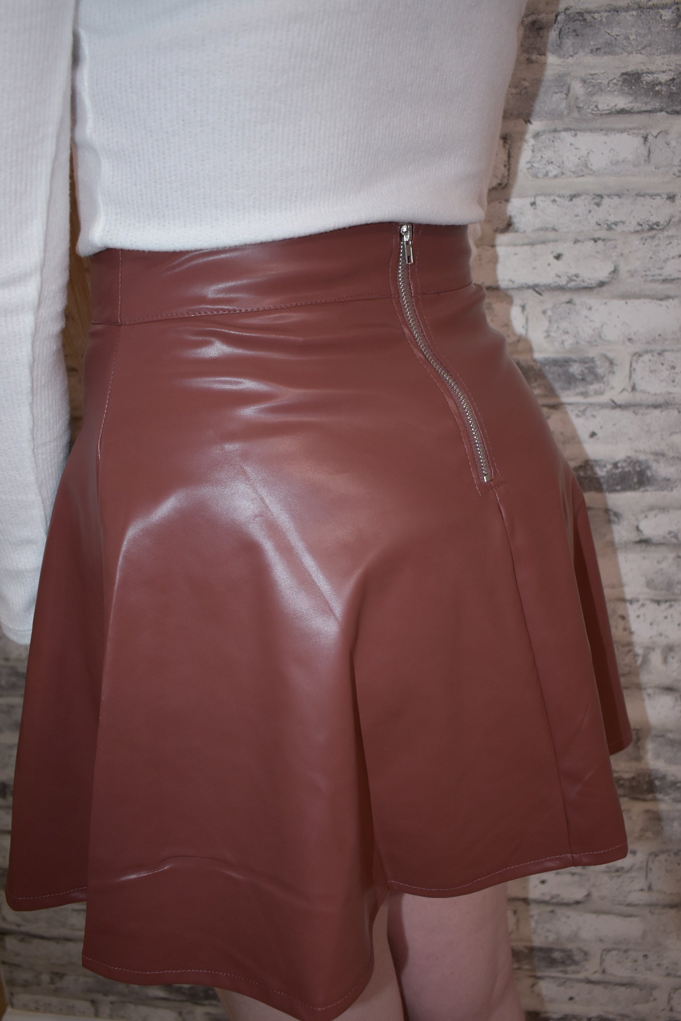 Model Jenny is wearing a size Medium and Model Katie is wearing a size Small in this Faux Leather Skirt. Skirt is made of Polyurethane, Polyester, and Spandex. Faux Leather Skater Skirt with Zip Up back. Paired with our Keeping Me Cozy Turtleneck.