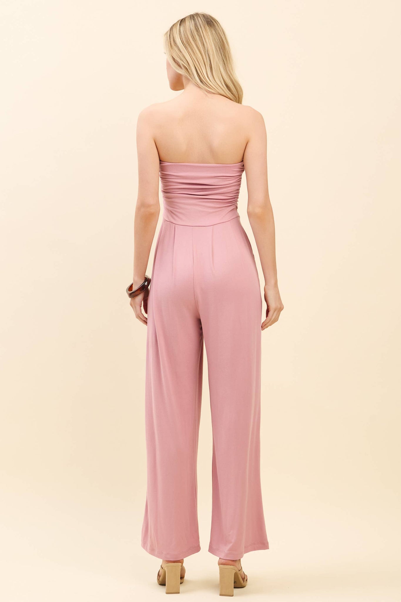 Soft, flattering, and effortlessly chic—the Rose Smoke Jumpsuit is your go-to one-and-done look. Designed in a dreamy smoky rose hue, this sleeveless jumpsuit features a strapless tube-top bodice with shirring for a comfortable, flexible fit that hugs in all the right places. Flowing palazzo-style legs create an elegant silhouette while still feeling relaxed and wearable.