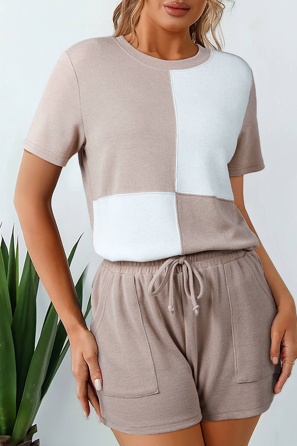 A playful twist on loungewear basics. This two-piece set features a modern color block design with a relaxed tee and drawstring shorts made from a soft, stretchy blend (60% Polyester · 35% Cotton · 5% Elastane). Equal parts comfy + eye-catching, it’s perfect for lounging at home or stepping out in effortless style.
