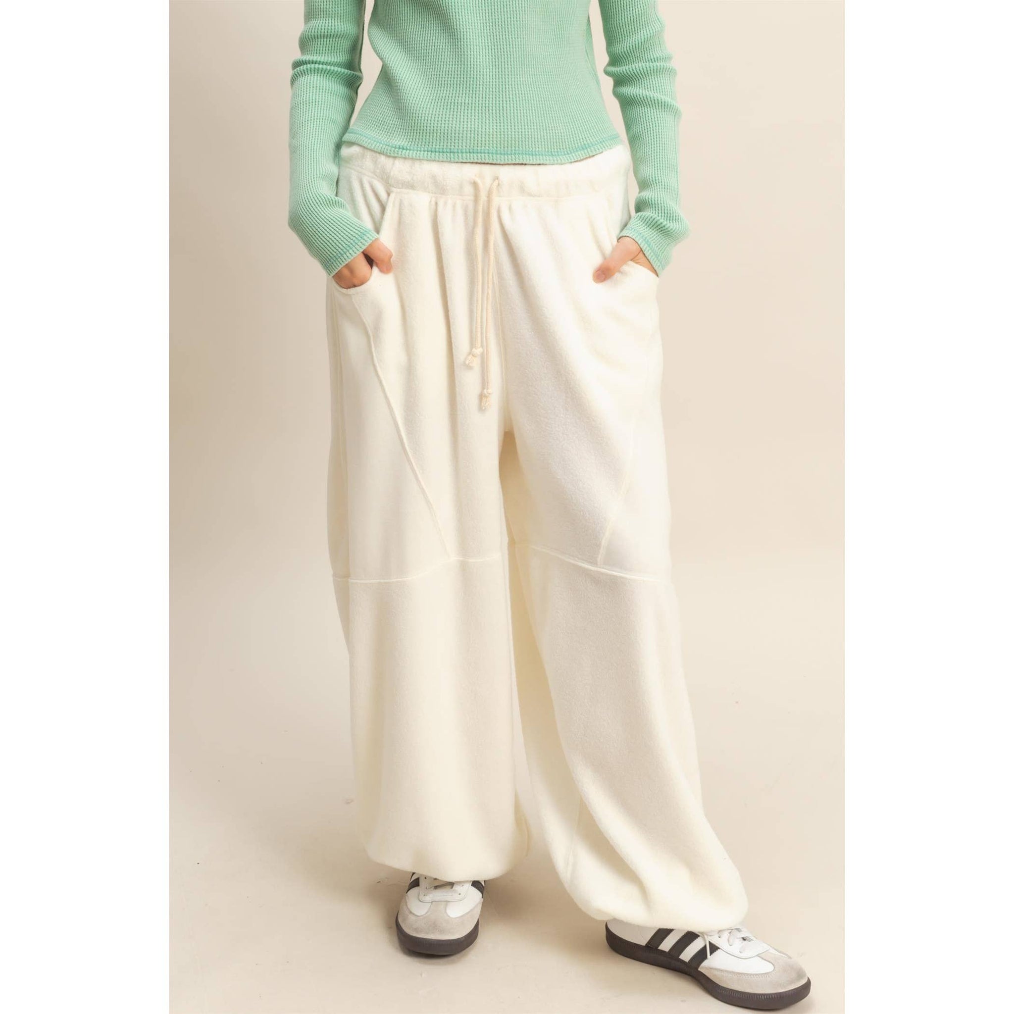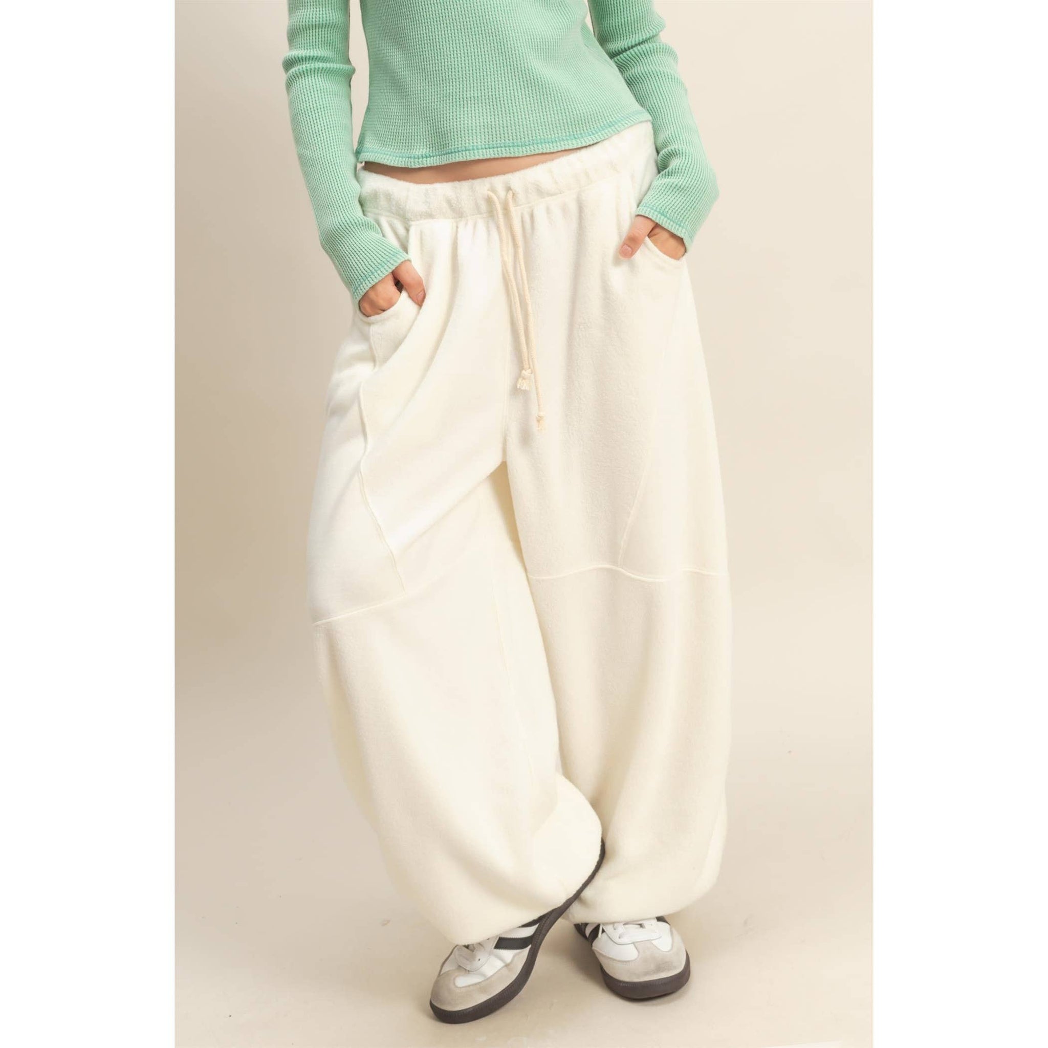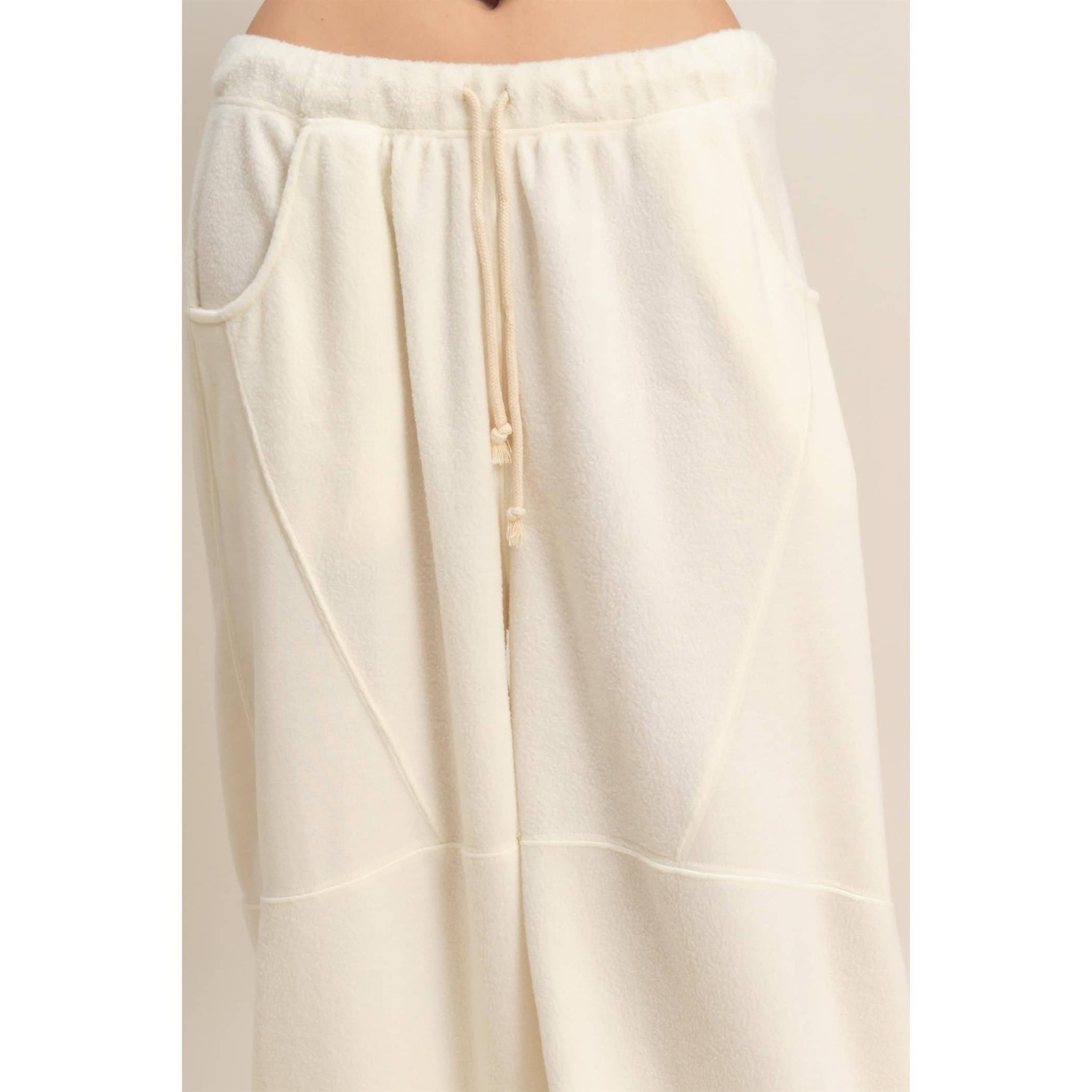 Float into comfort with the softest wide leg joggers in a dreamy cream hue. Perfect for slow mornings, coffee runs, or pairing with your favorite oversized sweater. Matcha mood who? We've got your neutral BFF now.